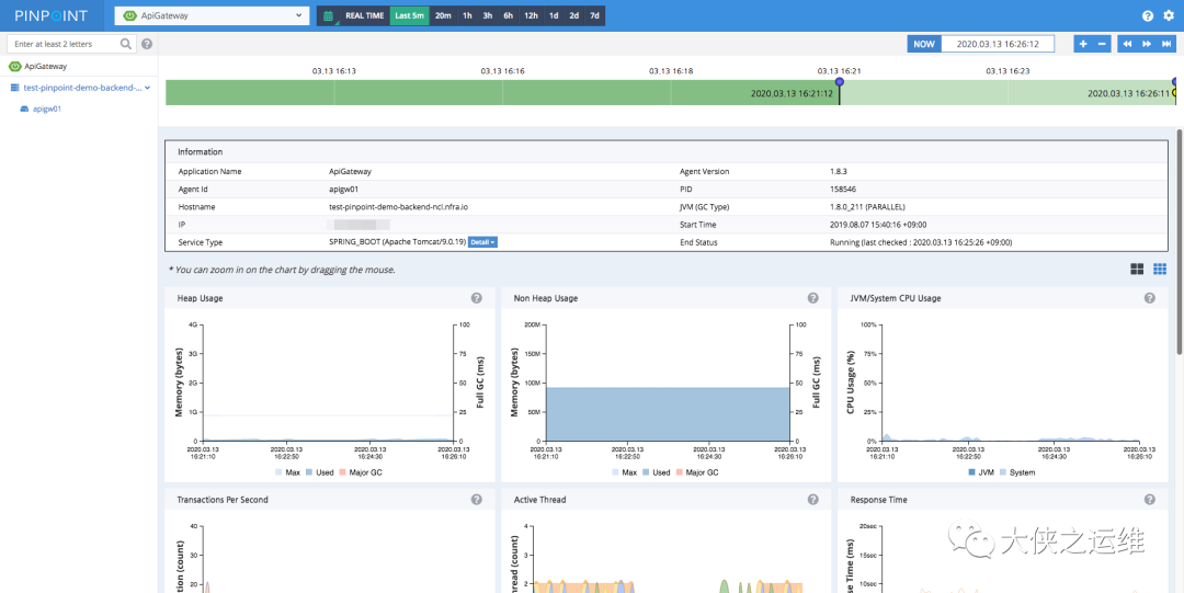 Pinpoint通过ServerMap可视化展示组件之间的互联关系,帮助用户理解分布式系统的拓扑结构。用户可以单击节点以查看有关组件的详细信息,如当前状态和事务计数。这有助于快速识别问题所在。