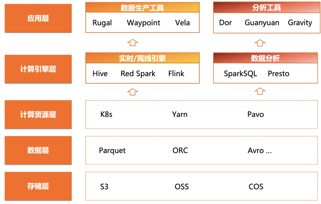 如上图所示,小红书的云原生大数据架构体系,自上而下分别是应用层、计算引擎层、计算资源层、数据层和存储层。