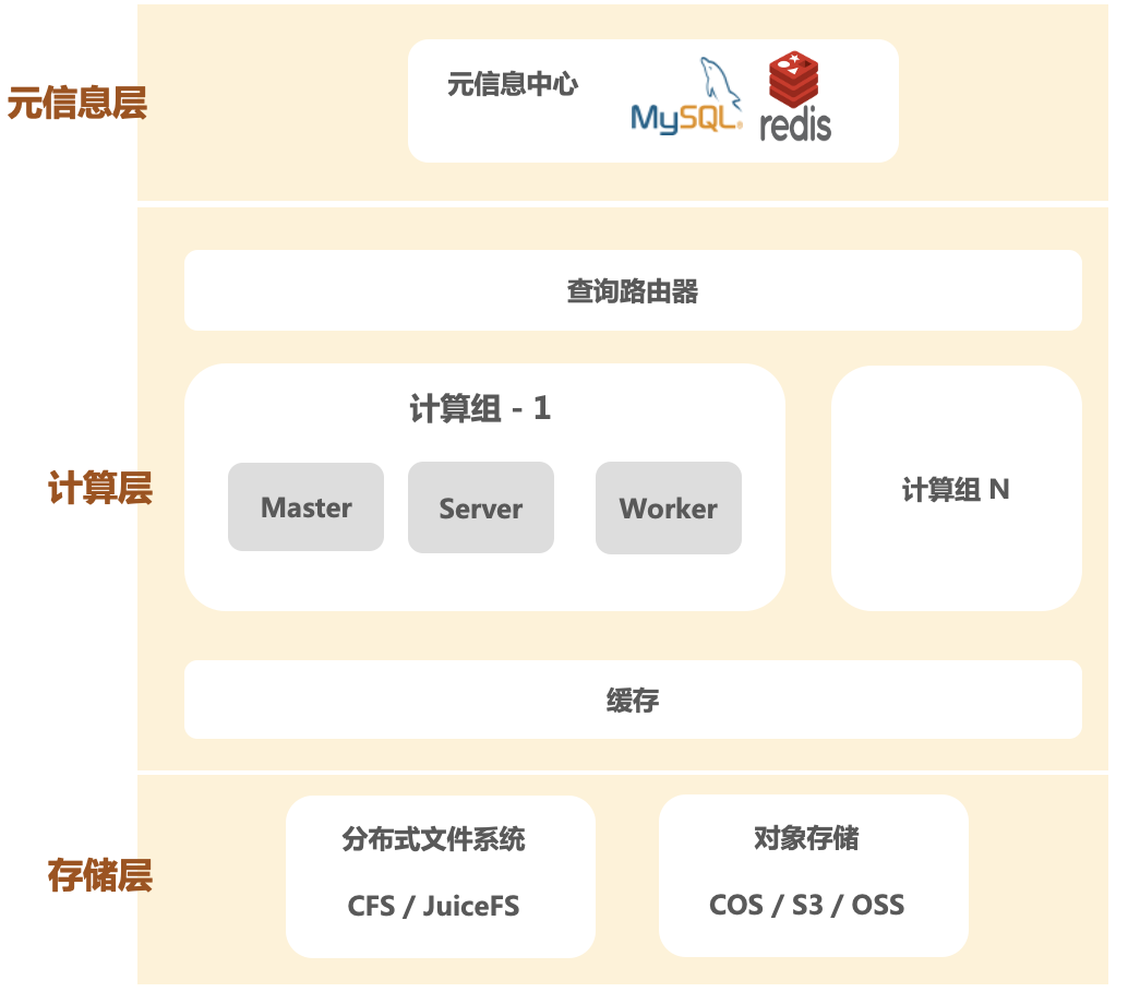 ● 存储层核心是各大云厂商提供的对象存储服务,数据层采用通用的数据格式如 Parquet、ORC、Avro 等,并通过 Hive Metastore 提供统一的元信息服务。