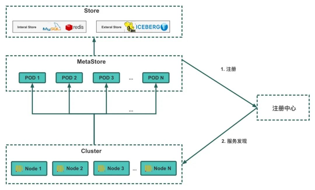 Metastore 与 REDck 之间的通信流程如下图所示,首先部署好的 MetaStore 会向注册中心发送注册请求,对服务进行注册。当 REDck 集群部署好后,会向注册中心请求进行服务发现,并访问发现的服务以获取元数据信息。