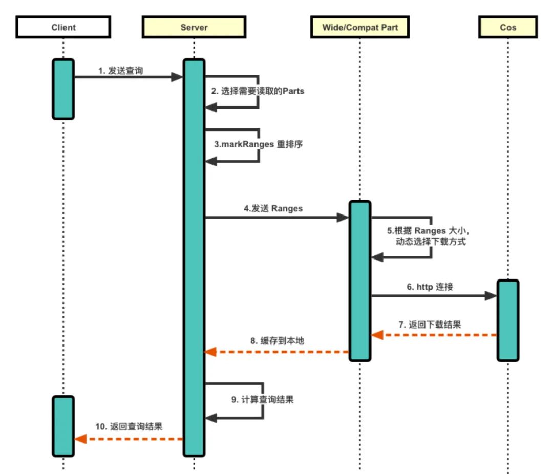 1. 客户端将查询发送至服务端,服务端根据查询选择需要读取的 Parts,同时对 Parts 的 markRanges 进行重排序,使每个连接线程读取相同 Part 的 Mark,减少连接次数,从而降低 HTTP 延迟。