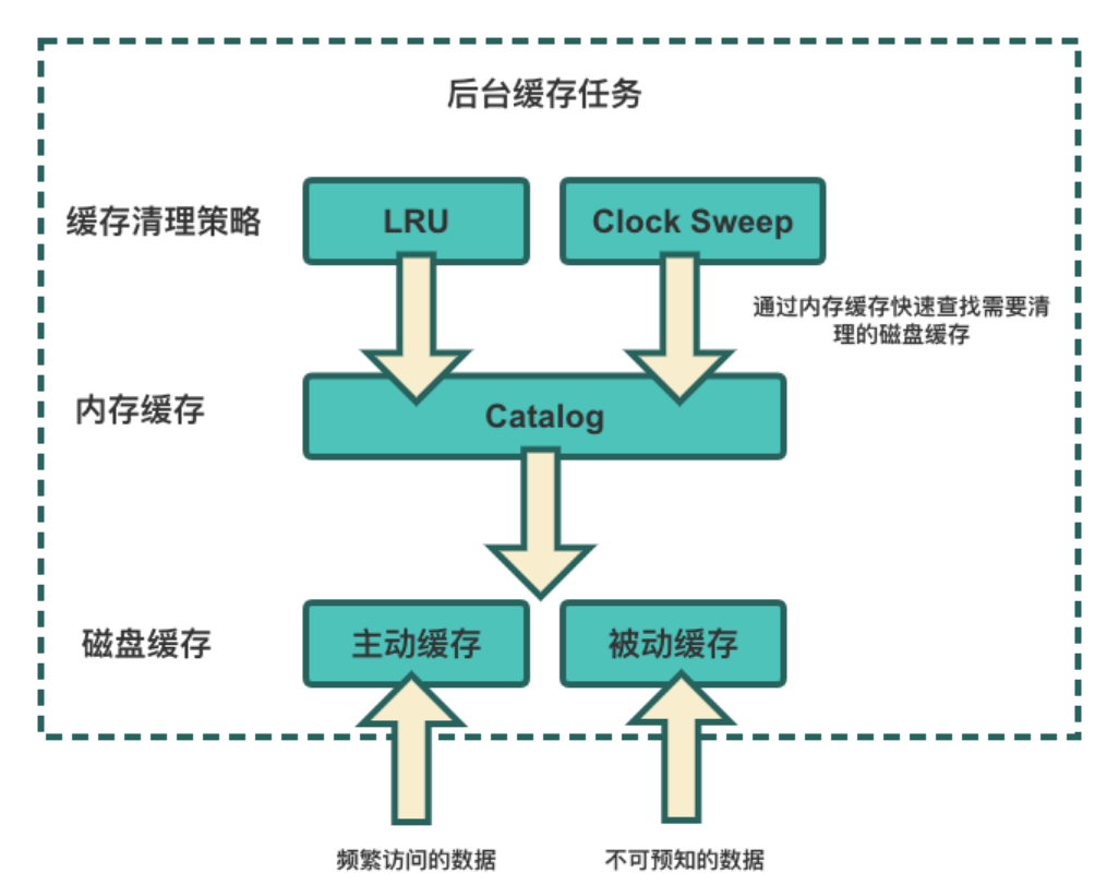 同时,由于本地磁盘空间有限,我们提供了两种缓存淘汰策略:LRU 和 Clock Sweep。为进一步优化缓存清理的速度,我们在内存中构建了磁盘的 Catalog,以便快速筛选需要淘汰的缓存数据。
