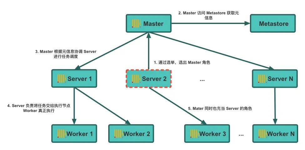 为实现统一调度,我们引入了全局选举唯一的 Master 角色,Master 指定特定的 Server 作为整表的全局任务协调者。该协调者根据预设的调度策略(例如按 bucket 进行调度),将不同的任务进行分配,以确保所有任务有序执行。但在集群异常情况下,可能会出现脑裂、任务分配重复等问题,为了解决这些问题,我们在整个任务执行的过程中增加了事务管理和异常检测逻辑,以保证不会有任务冲突,维护数据准确性。