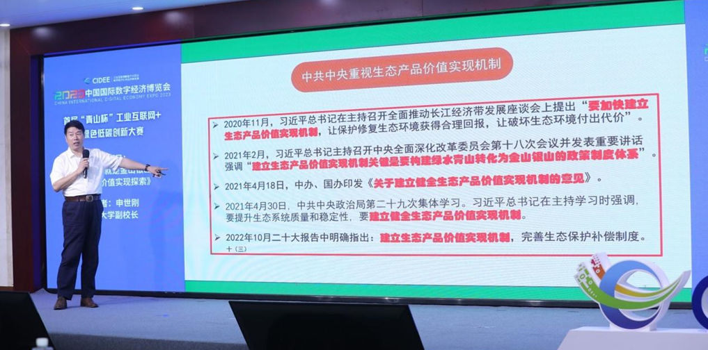 主旨演讲环节,河北大学副校长申世刚作《绿水青山就是金山银山 生态产品价值实现机制探索》主题报告,系统阐述生态产品价值实现机制背景与意义,分享涞源县生态产品价值实现案例。