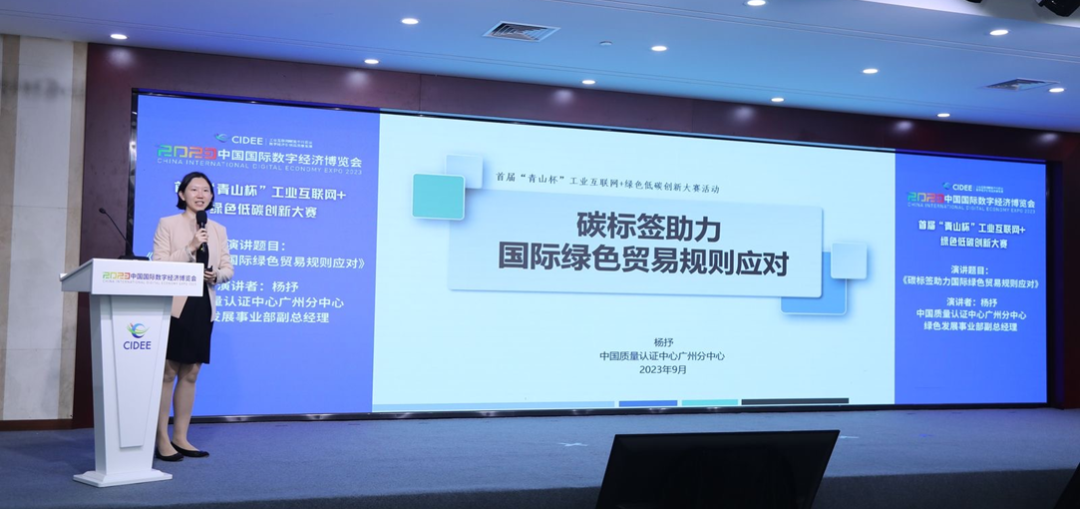 中国质量认证中心广州分中心绿色发展事业部副总经理杨抒作《碳标签助力国际绿色贸易规则应对》主题报告,分析国际气候变化新形势下绿色供应链与碳标签发展动态,提出国际绿色贸易规则的应对策略。