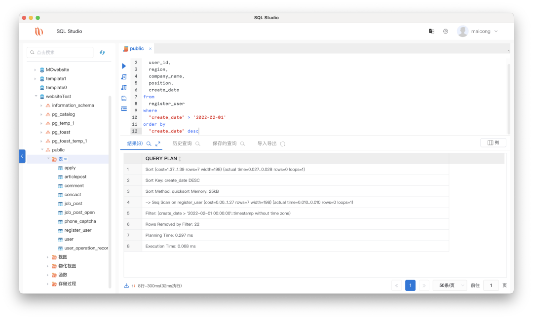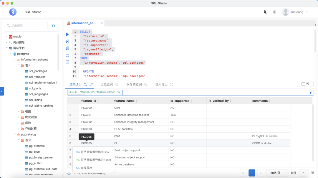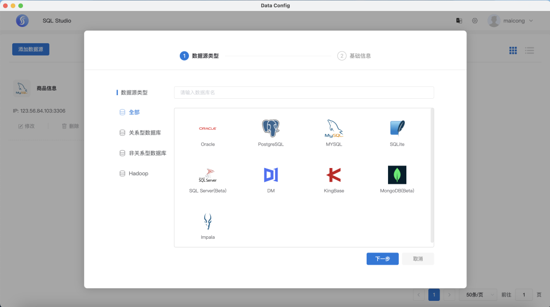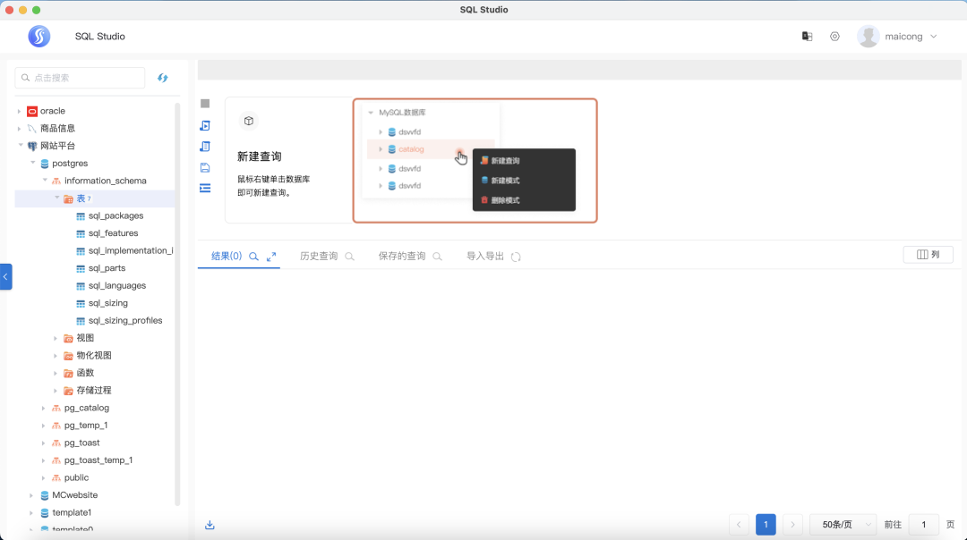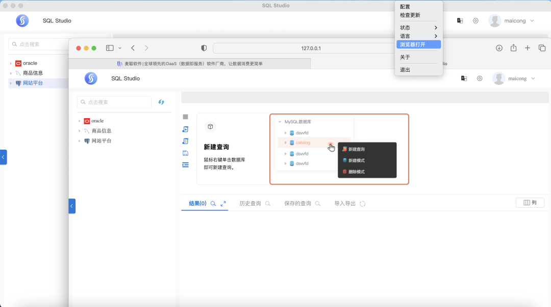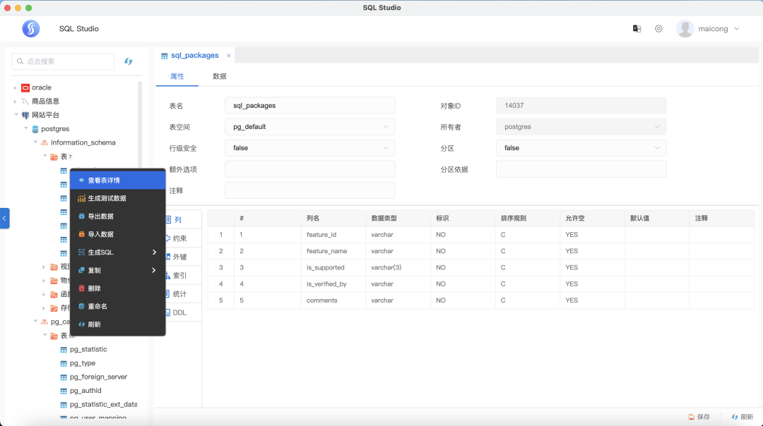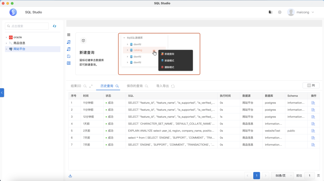 SQL Studio是一款多数据库管理工具,麦聪软件官网最新版本已更新至1.7.1,所支持的主流数据库包括PostgreSQL、MySQL、SQLite、SQL Server、Oracle、DM(达梦)、KingBase(人大金仓)、MongoDB(Beta)、Hadoop等数据库,后续版本还会支持更多类型和数量的数据库。