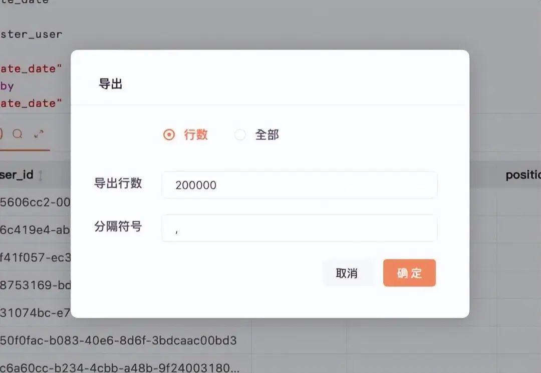 “结果导出”文件可以保存为CSV和Excel两种格式。默认1000行,数据配置中,可以根据需要自定义导出的行数,也可以全部导出。