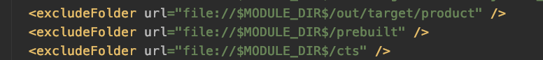 5、修改 android.iml 由于 android 源码文件数量太多,android studio 导入源码创建索引需要花费很长时间,为了能加快导入与打开速度,需要对 android.iml 做些修改,一般第一次使用可以把除 frameworks 等几个关键的目录外的其它目录全部加入 excludeFolder 节点。