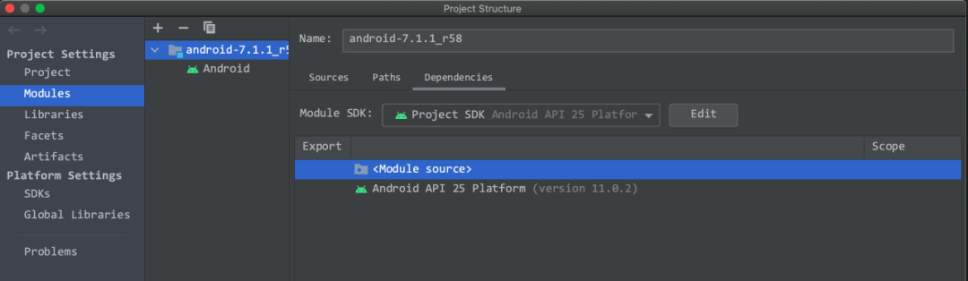 导入完成后 excludeFolder 与 orderEntry 节点也可以在 Project Structure面板修改跟直接修改 android.iml 文件效果一样。打开 Project Structure 面板 Module SDK 选择跟源码对应版本的 SDK ,这一步对接下来的源码调试非常重要。做完这一步接下来就可以愉快的阅读源码了。