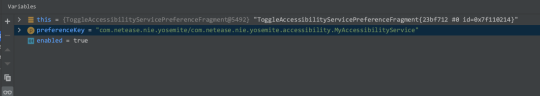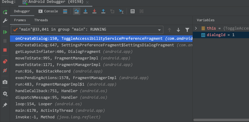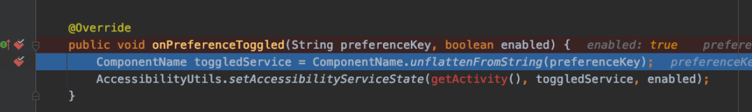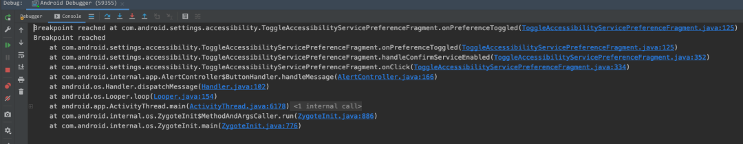 Accessibility 服务开关是在 Setting 中,所以我们第一步就要把 Setting 这个 app 打开,这时候才会显示com.android.setting这个进程,attach上这个进程,找到对应的源码打上断点,点击 Yosemite Help 的 Accessibility 服务开关就能触发断点了。