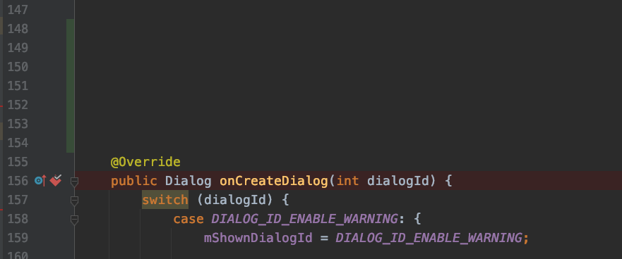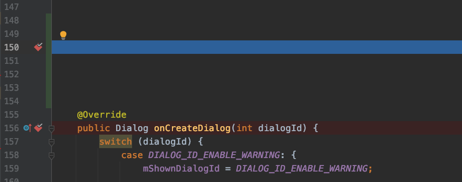 为了方便说明,我在源码中加入很多空行,并在 onCreateDialog 下个方法断点。