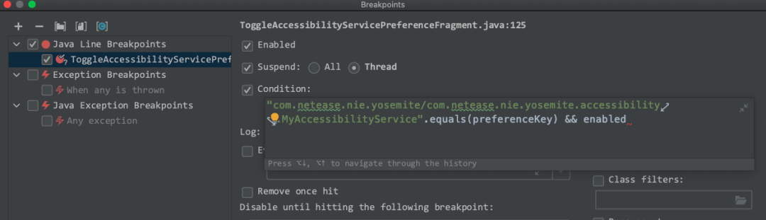 这里可以使用作用域为断点所在位置的各种变量,包括方法参数等。使用 condition 中有多个变量时, android studio 会提示错误,只要表达式的结果是布尔型就能正常工作,直接忽略报错就行。