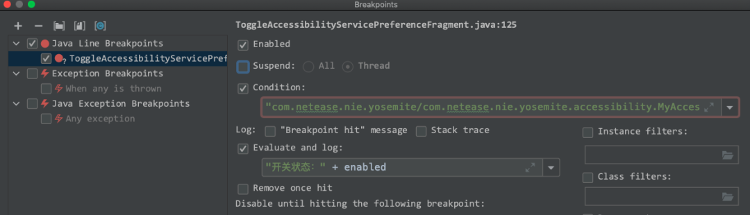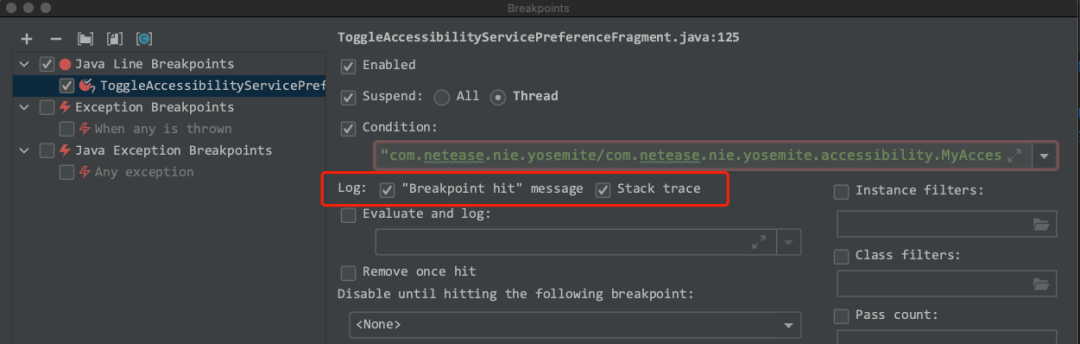 有时候我们需要使用日志来打印一些感兴趣的变量。常规的做法是在代码中加入 log 代码,对于普通的 app 这样或许还行得通,但是对于调试系统源码来说,这种做法效率就太低了。android studio 的调试功能给我们提供了一个非常好用的工具:我们可以在需要输出log的地方下断点,在 Breakpoints 面板里面把对应断点的 Suspend 的勾去掉,勾上 Evaluate and log 选项,在这里填入需要输出 log ,这样代码走到这个断点的时候只输出 log ,然后就继续往下执行了,比添加log 代码的方式效率提高了N 倍。