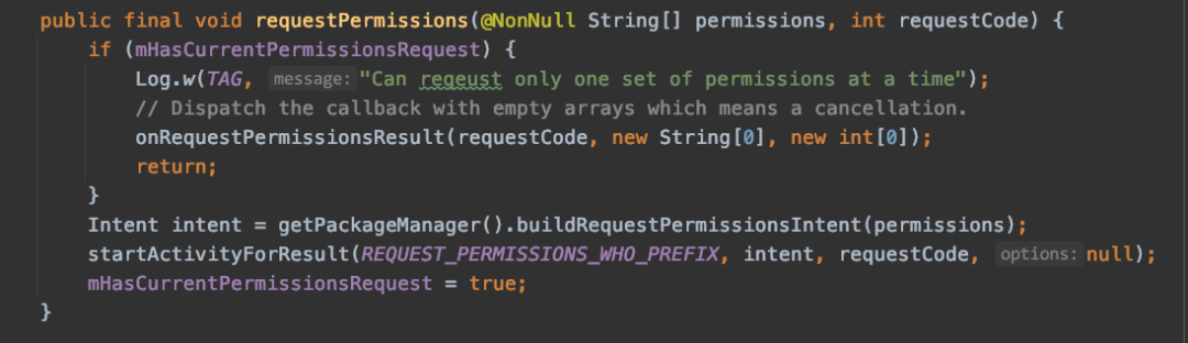 请求动态权限是通过调用 activity 的 requestPermissions 方法或者 ActivityCompat.requestPermissions 方法方法申请的,而 ActivityCompat.requestPermissions 最终也是调用 activity 的 requestPermissions 方法实现的。requestPermissions方法是通过 startActivityForResult 发送一个 action为“android.content.pm.action.REQUEST_PERMISSIONS”的隐式 intent 调起一个系统界面来给用户选择是同意还是禁止。
