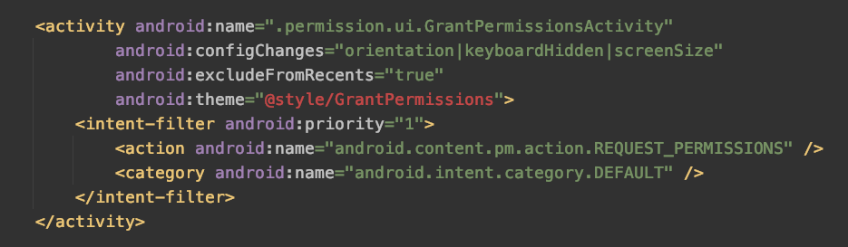 直接在源码中全局搜索这个action,能在packages/apps/PackageInstaller/AndroidManifest.xml 这个文件中找到响应这个 intent 是 GrantPermissionsActivity 这个 activity ,而这个 activity 是在 packageinstaller 这个系统 app 里面的。
