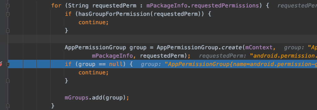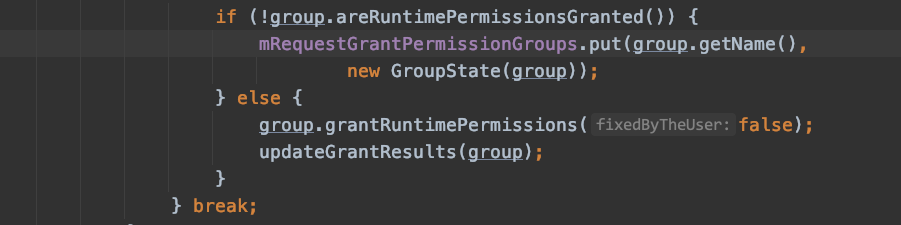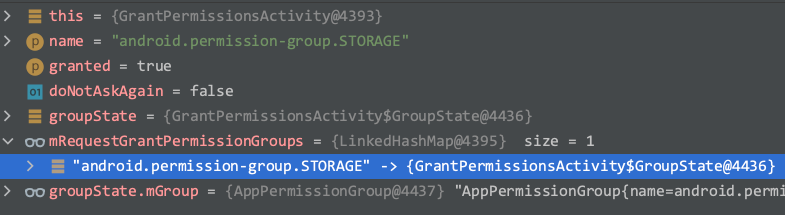 2、循环目标 app 动态申请的权限,如果在第 1 步的某个组中且还未授权,就把这个组加入 mRequestGrantPermissionGroups 这个 map 中。