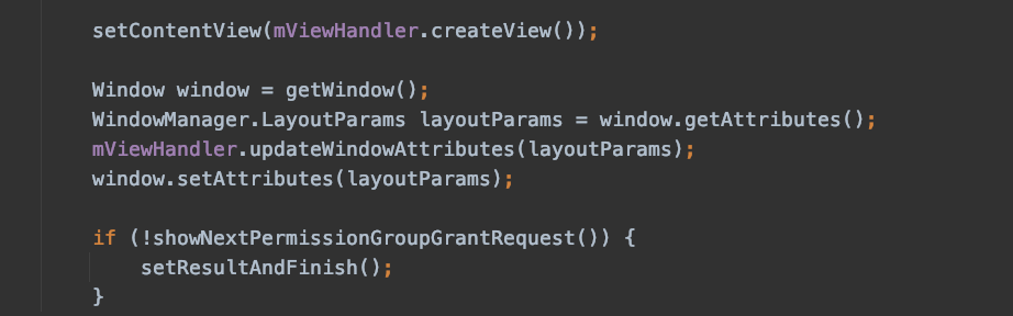 3、给弹框页面设置 View ,并轮询第 2 步中得到 map ,按组挨个展示权限授予 UI ,给用户选择禁止还是允许,直到轮询完毕,调用 setResult 与 finish 方法。如果已经授予了权限目标 app 还继续申请,mRequestGrantPermissionGroups 中的结合为空,showNextPermissionGroupGrantRequest 会很快返回 false ,用户也几乎感知不到弹框。
