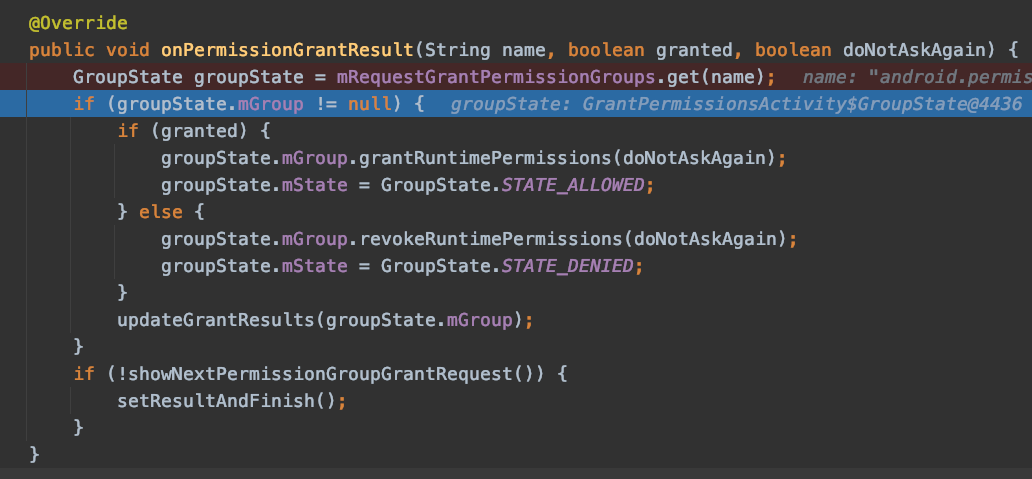 attach这个进程,接下来我们通过调试,来简要分析一下GrantPermissionsActivity中处理授权的过程: