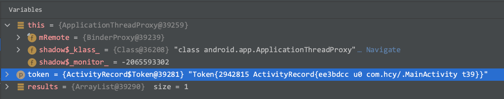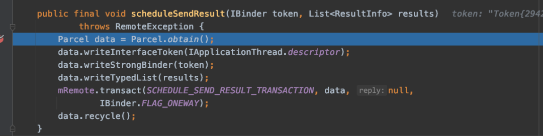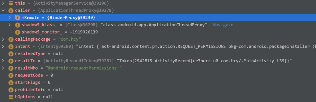 这时又得从源码找解决办法了,我们追踪 for result 的逻辑发现,发现在系统进程中最终是通过 ApplicationThreadProxy 的 scheduleSendResult 方法来发送数据的,这里有两个关键对象 token 与 mRemote ,我们想要模仿这个逻辑就必须拿到这两个对象,通过断点中显示的值与 startActivity 断点中的参数值对比,我们发现 mRemote 跟 caller 中的 mRemote 是一样的, token 与 resultTo 是一样的,至此我们就能借助 caller 与 resultTo ,把授权结果告知目标 app 。app 能无感知的接收结果,处理业务逻辑了。