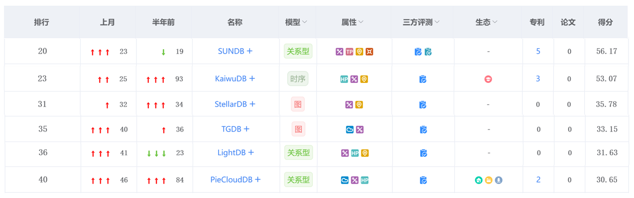 科蓝软件的SUNDB本月排名较上月提升3位,排名第20名,与其注重生态建设息息相关。SUNDB数据库是科蓝软件潜心二十余年自研的国产数据库品牌,研发团队坚持从0到1的原始创新,工信部评测核心源代码自研率为98.31%,已通过中国信通院“可信数据库”评测。目前,科蓝软件SUNDB已在中国移动、中国联通、中化化肥、多省市智慧城市、多家银行及非银金融机构、央企国企等核心业务系统上线,为各行业数据库国产化替代树立了标杆。