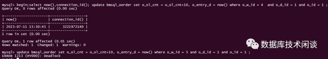 mysql> update bmsql_oorder set o_ol_cnt = o_ol_cnt+10, o_entry_d = now() where o_w_id = 5 and o_d_id = 1 and o_id = 1 ;ERROR 1213 (HY000): Deadlock