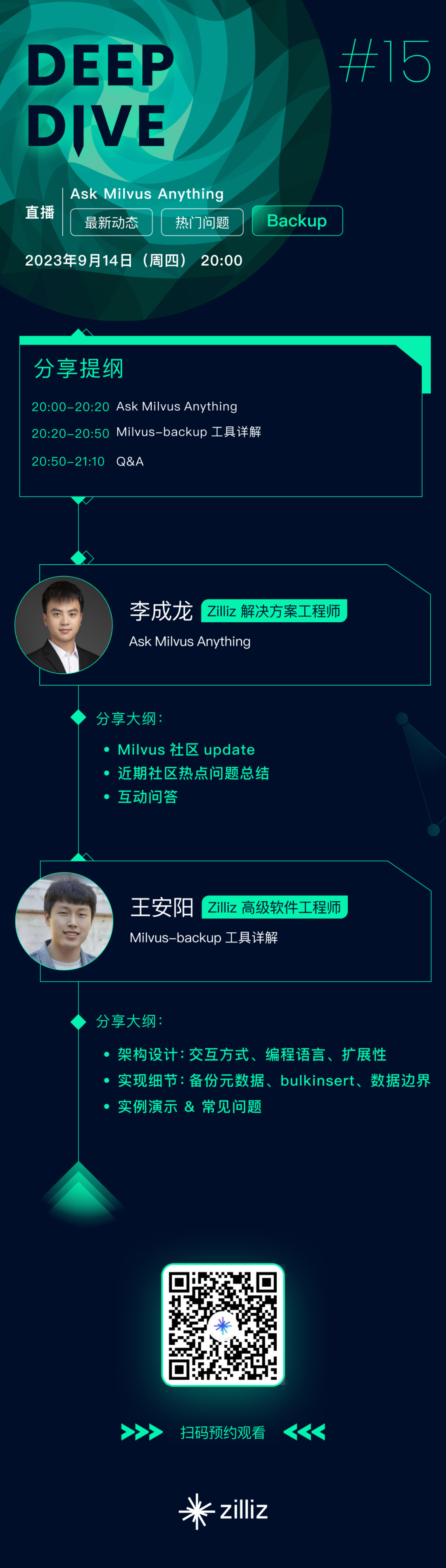 接下来介绍一下本期直播的主角——Backup。数据安全、容灾备份用户在数据服务运维中最关心的需求,Milvus-backup 就是专门为 Milvus 开发的数据备份和恢复工具。本次直播我们将邀请到 Zilliz 高级软件工程师王安阳,他将为大家讲解关于 backup 的那些事。同时,我们的老朋友——小龙将再度亮相,为大家分享 Milvus 2.3 发布之后,Milvus 社区里大家最关心的那些事。
