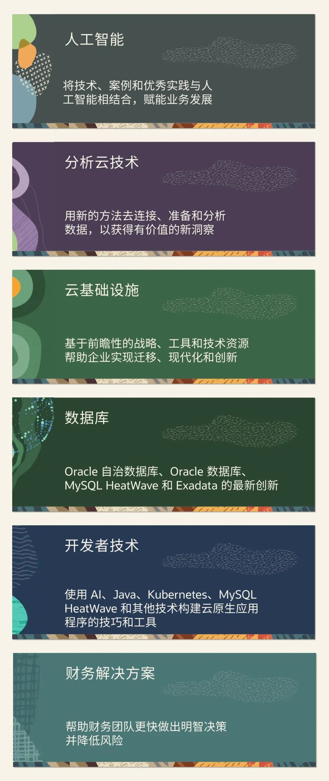 众多来自甲骨文公司数据库、云技术等领域的领军人物将携手全球行业专家、知名企业领袖、合作伙伴欢聚一堂。碰撞新思想、分享新观念,深度探讨全球范围的技术创新、行业未来趋势,分享利用全新云技术和数据技术成功实践的故事,帮助企业解锁数据价值,助力企业轻松构建云上应用,以实现业务的可持续发展。