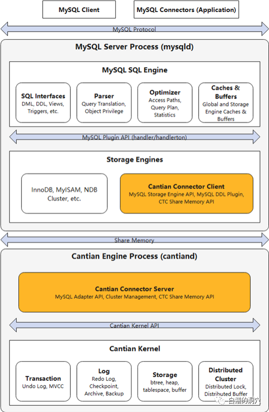 https://gitee.com/openeuler/cantian上图是Cantian的一个逻辑架构图,基于企业级集中式存储,Cantian引擎在MySQL的SQL引擎与innodb存储引擎之间构建了一个中间层,这个中间层可以模拟innodb的行为,因此MySQL的SQL引擎可以十分方便地与之对接。因为innodb和事务控制是紧密相关的,因此Cantian里除了包含MySQL的存储层外还包含了MySQL的事务管理层。在MySQL中引入Cantian引擎的好处是,加入这个中间层后,MySQL就具备了多节点并发读写的能力,摇身一变就变成了MySQL RAC了。上面这张图能够让大家更好地理解参天引擎。在Cantian中,undo/temp/log虽然也存储在共享存储中,不过是实例独占式访问的,不在集群层面共享,平时只能在实例内读写。只有故障恢复时,集群中的其他实例才能读取。控制文件、system/users等表空间是可以在集群中并发读写的。那么Cantian是如何实现多实例并发读写的呢?在本文第一张图中有一个Global Cache的示意,在多个实例之间通过缓冲区融合技术实现了多实例一致性访问。Cantian实现全局缓冲的算法与Oracle 9I RAC有些类似,根据算法,可以确定某个缓冲块的Master实例,当某实例拥有current block的时候可以直接访问,否则需要通过Master咨询该block是否在某个实例的缓冲中。Master通知该块的持有者将其发送给需要的数据库实例。大家看看上面这张Oracle 9i RAC Cache fusion的示意图,是不是有点和上面的图十分相似的感觉。不过Cantian在缓冲区融合算法的实现上和Oracle Cache Fusion有较大的差别,并且由于UNDO的访问特性限制,当MVCC需要一个经过多个实例多次变更的PRE-IMAGE的时候,在Cantian引擎里的组装过程有些复杂,需要一级级的向前传递,最终才能完成获取。这种模式的数据访问如果发生在一个多实例环境下,Cantian引擎可能存在一定的性能问题。如果能够实现在一个实例完成多次构建,则效率要高很多,只不过这可能会让分布式锁管理更为复杂。目前Cantian实现的Cache Fusion算法还只是第一代,随着该项目的发展,我想这方面的算法会进一步优化。目前Cantian已经实现了与MySQL的对接。MySQL SQL 层与 CTC 通过 MySQL 预定义的 hanlder/handlerton 接口进行交互,CTC插件接收到 MySQL SQL 引擎调用存储引擎插件执行的请求,通过共享内存通信模块以及对接层逻辑将请求转到 Cantian 引擎内核,CTC 插件与 Cantian 引擎通信模块设计为统一接口,动态可替换机制,支持单进程接口直接绑定、双进程共享内存通信两种部署模式。一个 Cantian 引擎进程可以对接一至多个 MySQL 实例,不同实例间通过不同的共享内存通道与 Cantian 引擎进行通信,CTC 插件会维护实例的启停时集群资源的分配与释放。MySQL 元数据仍通过 InnoDB 引擎存储与维护,但 MySQL 对元数据的修改操作会通过 CTC 与 Cantian 引擎广播到集群中存活的其他 MySQL 实例以保证集群的元数据一致性。广播过程中远端 MySQL 实例会使用对应权限的代理用户执行修改操作,从而保证集群执行语句时的用户权限的一致性。