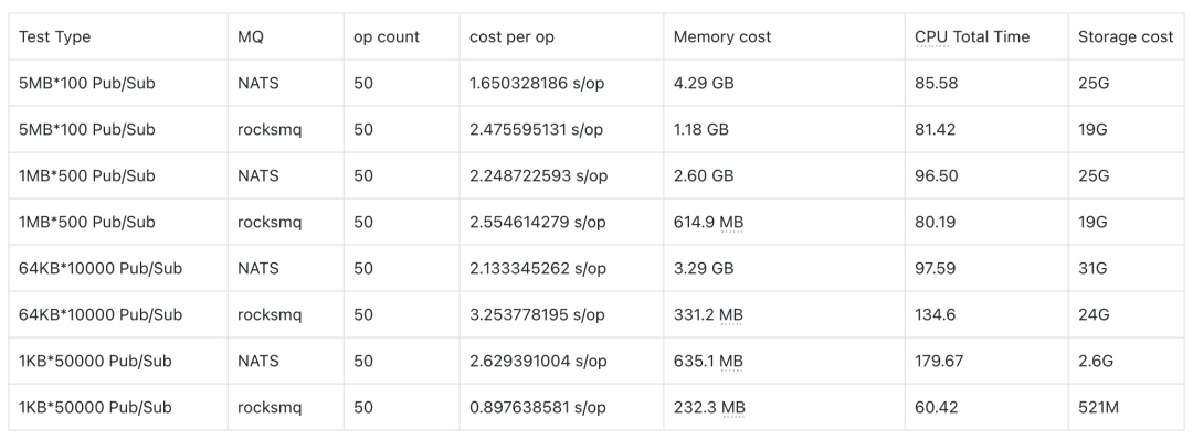 NATS 为纯 GO 的实现,而 RocksMQ 使用 CGO 与 rocksdb 的 lib 交互。因此 NATS 的绝大部分内存由 GO 的 GC 接管,而 RocksMQ 依赖 lib 自身的内存管理。NATS 的内存开销会更高。