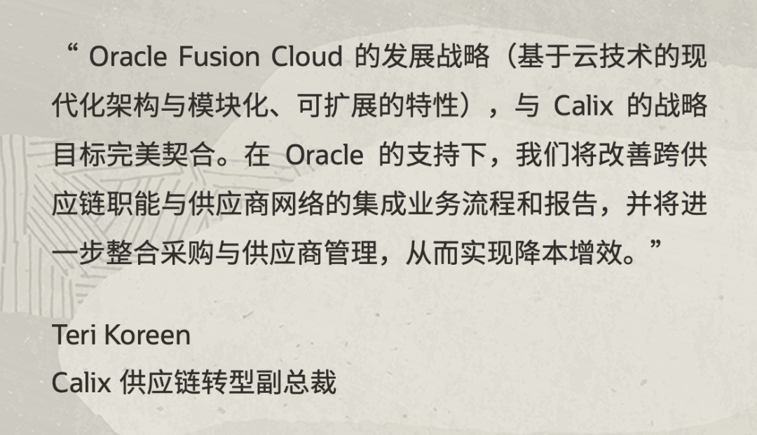在了解到云技术应用具有低成本且快速更新的优势,能为企业带来创新机遇后,Calix 坚定了上云的目标,采用了包括供应链计划 (Supply Chain Planning)、库存管理 (Inventory Management)、制造 (Manufacturing)、维护 (Maintenance)、订单管理 (Order Management)、采购(Procurement)、产品生命周期管理 (PLM)等模块在内的 Oracle Fusion Cloud Supply Chain Management (SCM)。