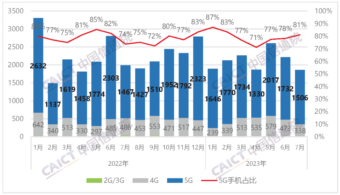 2023年7月,国内市场手机出货量1855.2万部,同比下降6.8%,其中,5G手机1505.8万部,同比增长2.6%,占同期手机出货量的81.2%。