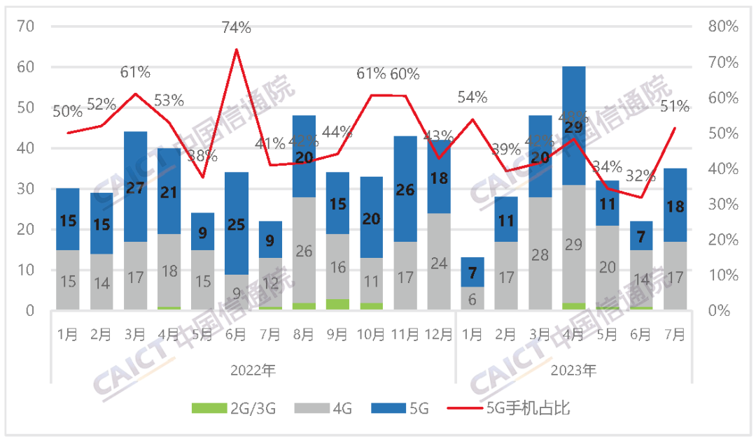 2023年1-7月,上市新机型累计238款,同比增长6.7%,其中5G手机103款,同比下降14.9%,占同期手机上市新机型数量的43.3%。