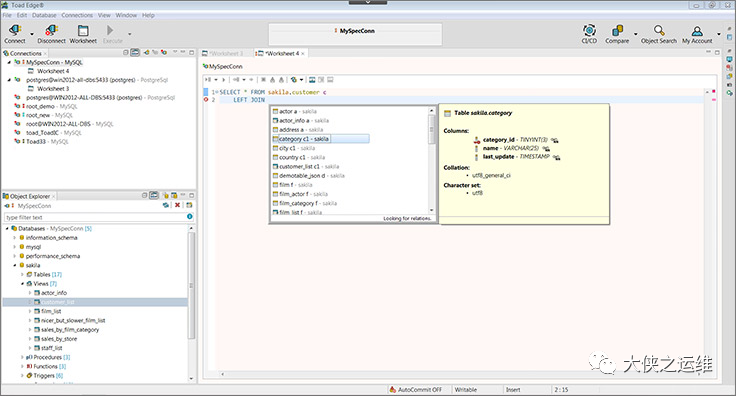 MySQL Workbench: 特点:MySQL官方工具、数据库建模、SQL开发、性能调整。 用途:适用于开发人员和DBA,提供了全面的数据库设计和管理功能,包括建模、查询构建、性能监控等。