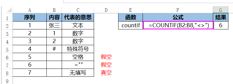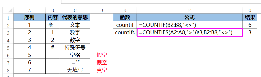 COUNTIFS(......,B2:B8,"<>"),表示第二个条件,满足内容列里非空单元格的个数。排除掉序列号7,只留下了4、5、6,所以结果为3。