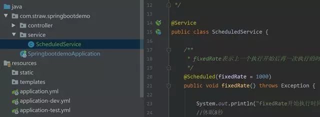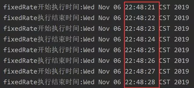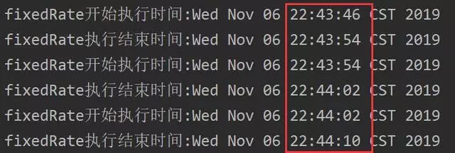 @Scheduled(fixedRate = 1000)public void fixedRate() throws Exception {System.out.println("fixedRate开始执行时间:" + new Date(System.currentTimeMillis()));//休眠8秒Thread.sleep(1000 * 8);System.out.println("fixedRate执行结束时间:" + new Date(System.currentTimeMillis()));}