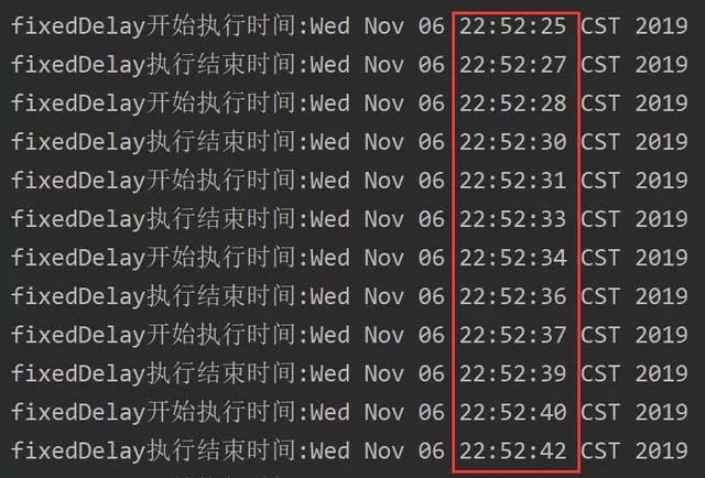 fixedDelay表示上一次执行结束后再一次执行的时间,启动项目,可以看到上一次执行结束后还等了1秒才执行下一次。@Scheduled(fixedDelay = 1000)public void fixedDelay() throws Exception {System.out.println("fixedDelay开始执行时间:" + new Date(System.currentTimeMillis()));//休眠两秒Thread.sleep(1000 * 2);System.out.println("fixedDelay执行结束时间:" + new Date(System.currentTimeMillis()));}