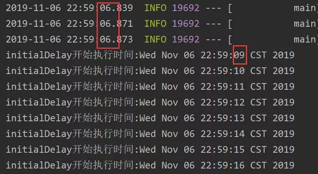 @Scheduled(initialDelay = 1000*3, fixedDelay = 1000)public void initialDelay() throws Exception {System.out.println("initialDelay开始执行时间:" + new Date(System.currentTimeMillis()));}