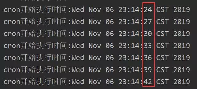 @Scheduled(cron = "*/3 * * * * ?")public void cron() {System.out.println("cron开始执行时间:" + new Date(System.currentTimeMillis()));}