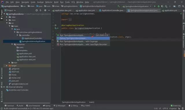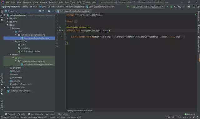 简单的看下创建的项目结构,SpringbootdemoApplication是这个项目的一个启动类。