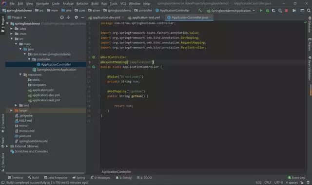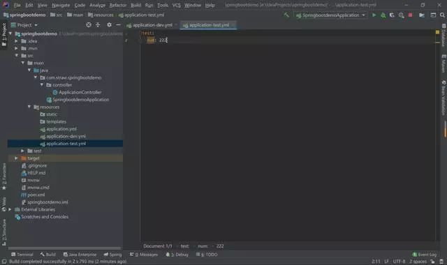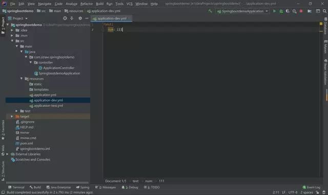 新建两个文件application-dev.yml 和 application-test.yml,里面num的值分别是 111、222。在application.yml文件中指定我们要使用哪一个文件。