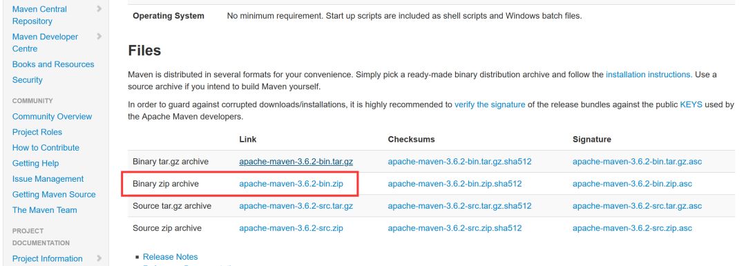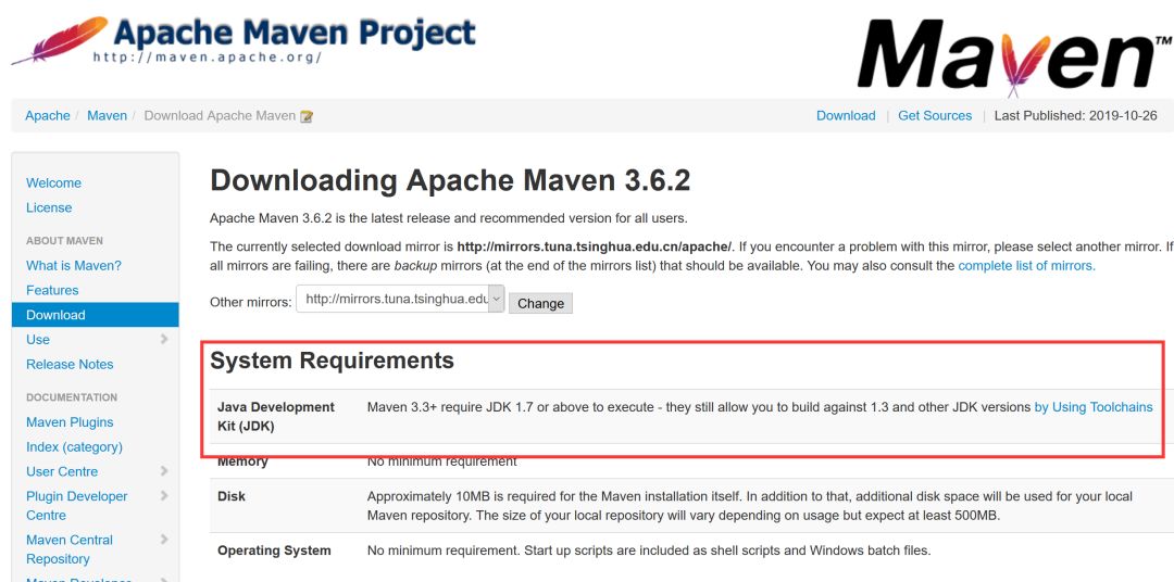 进入官网下载,现在最新的版本为3.6.2。要使用Maven要保证已经安装了jdk并可以使用,可以看到3.6.2要求jdk版本必须1.7以上。