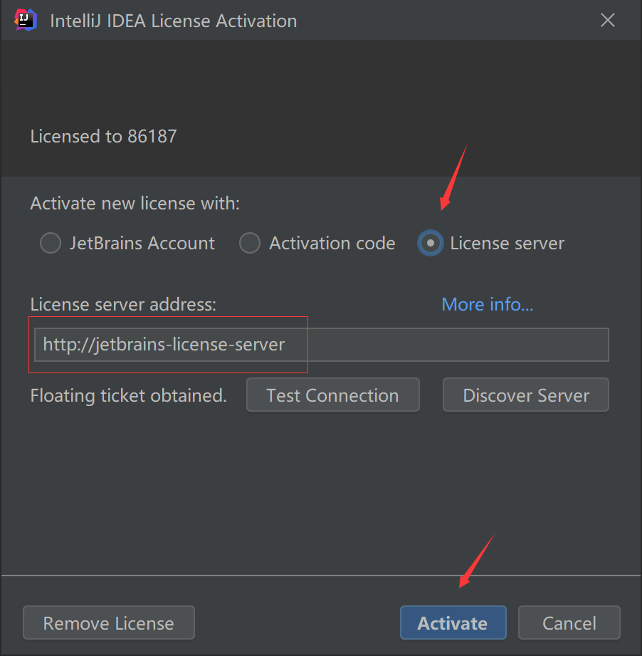 激活方式显示License server,方框中的会自动填写,然后点激活