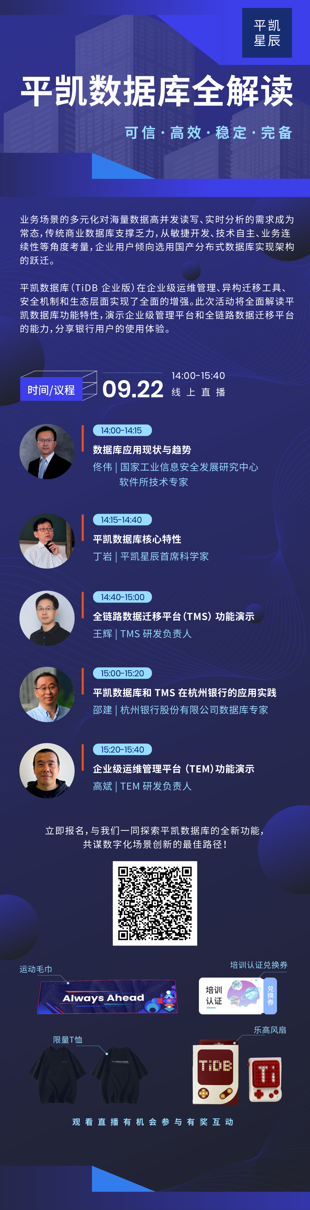 9 月 22 日 14:00-15:40,平凯数据库重装亮相,全解读活动将在线上进行。本次发布会上,我们邀请到了多位产业同仁、技术专家和银行用户,从产业趋势、内核技术、应用实践等角度全面解读平凯数据库,更有企业级核心功能的实操演示。