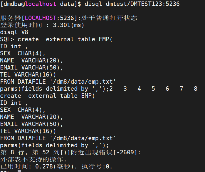 7、各种查找,各种修改格式和执行语句,无果,最后误打误撞,看到网有人提示说,dm8新版本的数据库不再支持外部表导入数据不配置directory,所以尝试配置,如下: