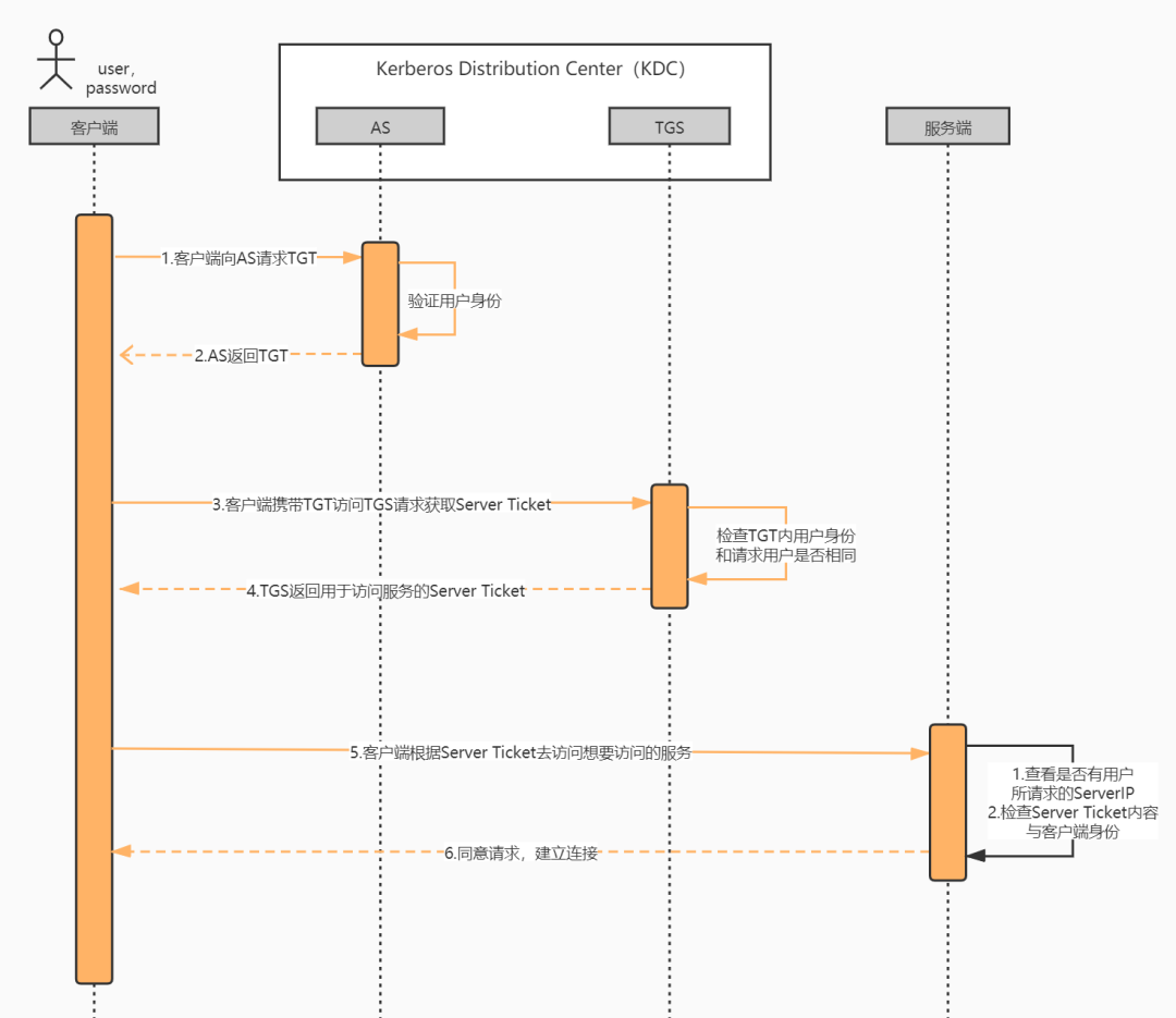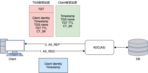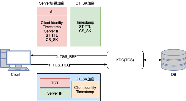 AS(Authentication Server): 认证服务器,用于认证客户端的身份,并发放客户端用于访问 TGS(Ticket Granting Server)的TGT(Ticket Granting Ticket) TGS: 发放整个认证过程和客户端访问服务端时所需的服务授予票据(Ticket) DB: 一个用于存储认证信息的数据库