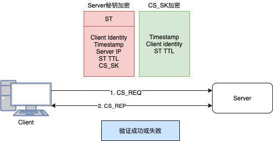 client 使用 CT_SK 解密获取与 server 通信的 session key(CS_SK),最后向 server 发送图示两部分内容进行最后的验证。