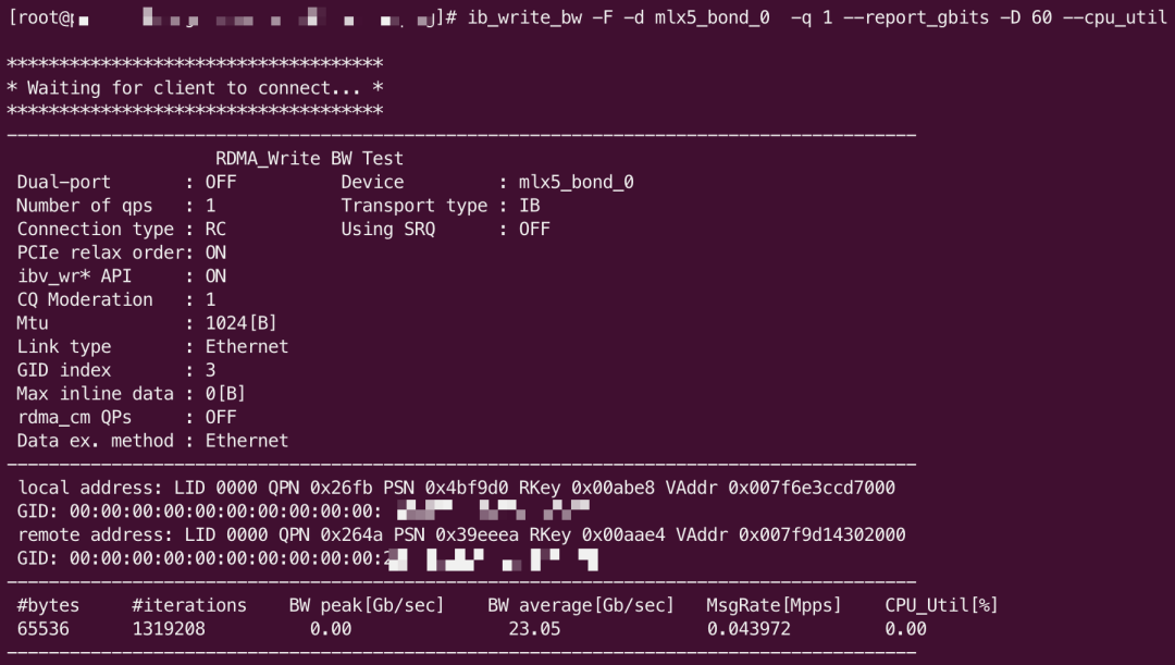 ib_write_bw -F -d mlx5_bond_0 -q 1 --report_gbits -D 60 --cpu_utilib_write_bw -F -d mlx5_bond_0 -q 1 --report_gbits -D 60 --cpu_util <Server IP Address>ibv_devinfo命令输出中的