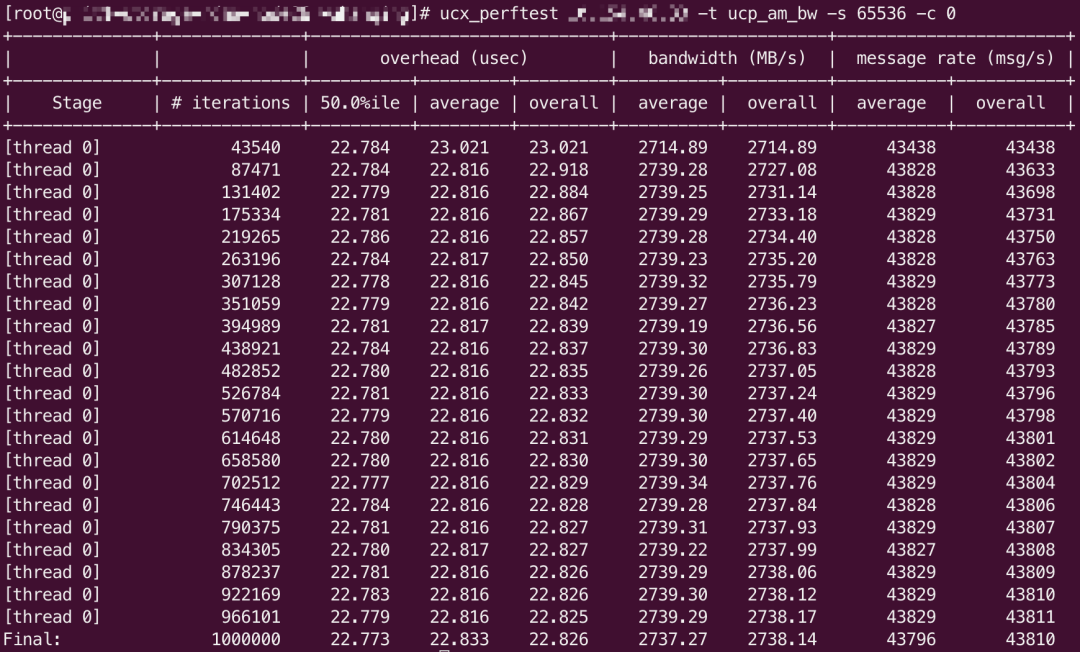 portucx_perftest -c 0ucx_perftest <Server IP Address> -t ucp_am_bw -c 0 -s 65536