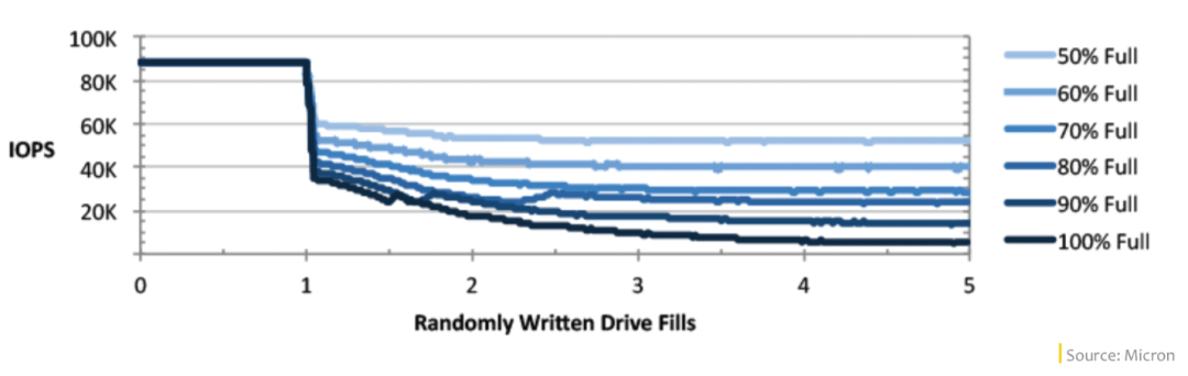 然后我们就从 nvme 驱动、固件方面入手,分析了几天还是没有进展,经过多次内部讨论,意外发现磁盘性能下降跟 nvme OP(Over-Provisioning) 空间大小有关。