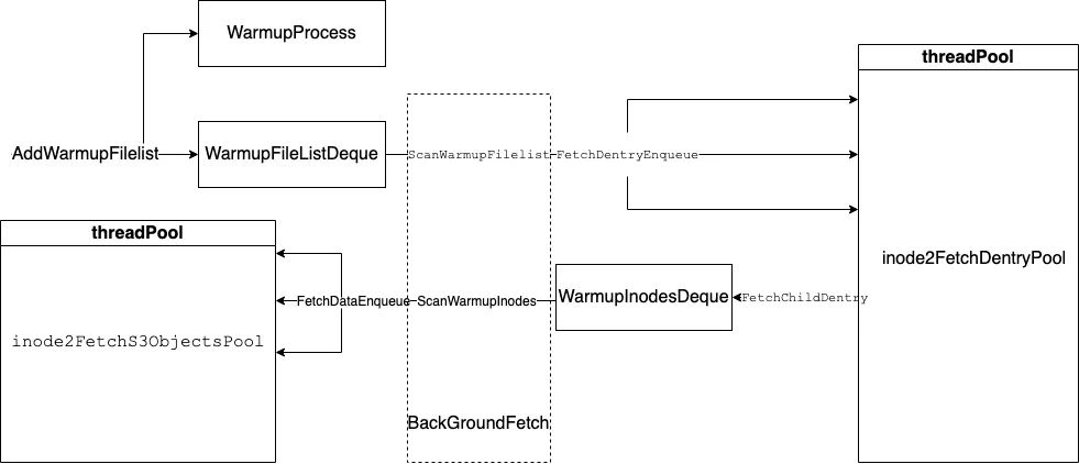 class WarmupFile { // 预热文件fuse_ino_t key_;uint64_t fileLen_;};using warmupFilelist = WarmupFile; // 预热列表文件。即文件中保存的是要预热的文件列表class WarmupInodes {fuse_ino_t key_;std::set<fuse_ino_t> readAheadFiles_;};class WarmupObjs {fuse_ino_t key;std::list<std::pair<std::string, uint64_t>> prefetchObjs;};class WarmupProcess {uint64_t total;uint64_t done;}class WarmupManager {// warmup progressstd::unordered_map<fuse_ino_t, std::shared_ptr<WarmupProgress>>inode2Progress_;BthreadRWLock inode2ProgressMutex_;std::deque<WarmupFilelist> warmupFilelistDeque_;mutable RWLock warmupFilelistDequeMutex_;std::unordered_map<fuse_ino_t, std::unique_ptr<ThreadPool>>inode2FetchDentryPool_;BthreadRWLock inode2FetchDentryPoolMutex_;std::deque<WarmupInodes> warmupInodesDeque_;mutable RWLock warmupInodesDequeMutex_;std::unordered_map<fuse_ino_t, std::unique_ptr<ThreadPool>>inode2FetchS3ObjectsPool_;BthreadRWLock inode2FetchS3ObjectsPoolMutex_;};